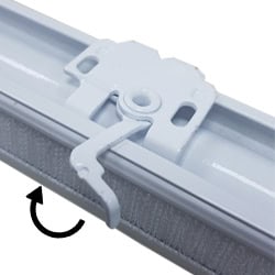 The swivel brackets included with your blind feature a slight lip that inserts into the top of the headrail, near the front. Use a gentle swinging motion to slot the headrail into place. You may need to angle the blind slightly to ensure proper alignment. Ensure that the front arm of the bracket is opened counter-clockwise for the next step.